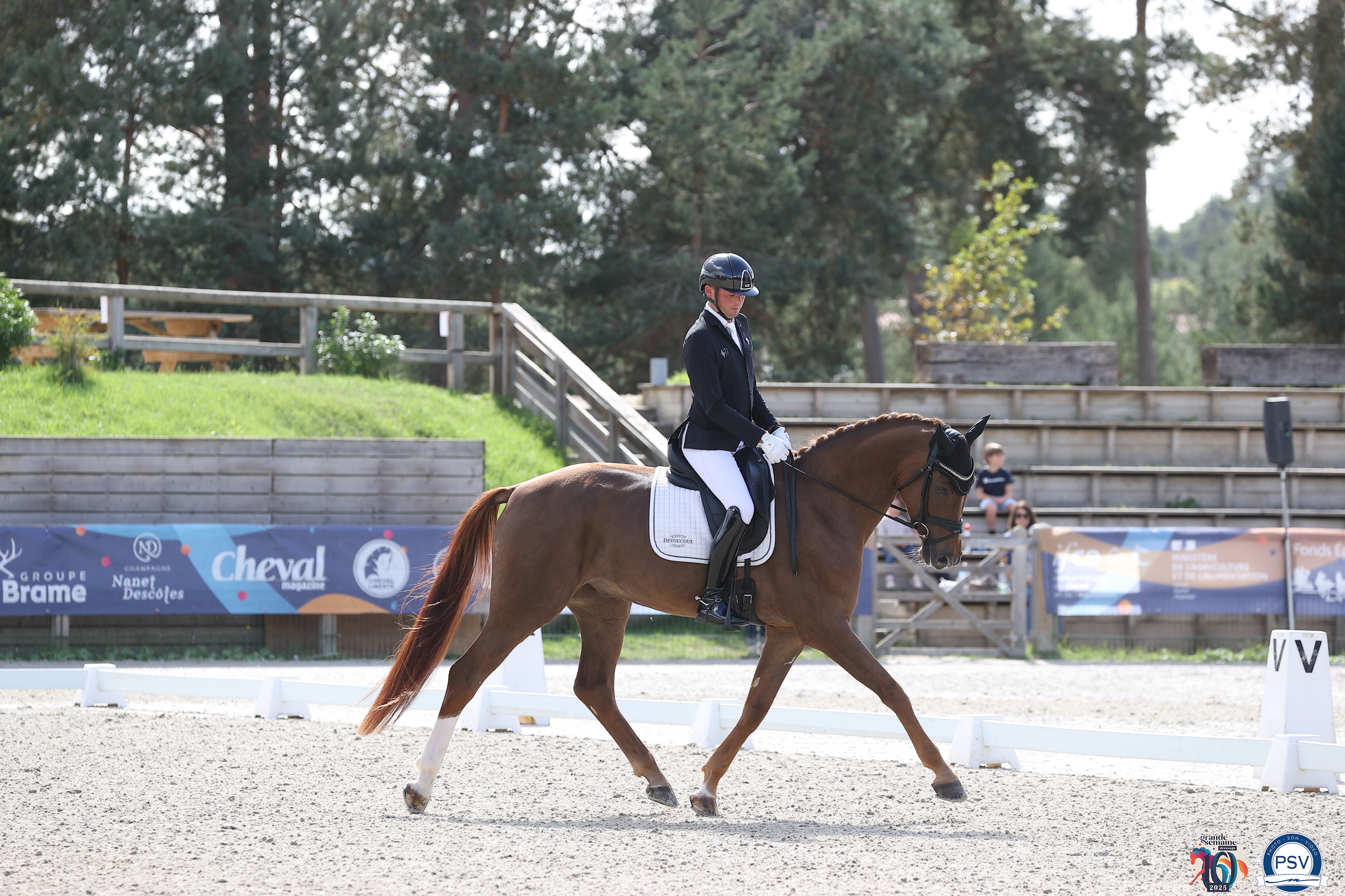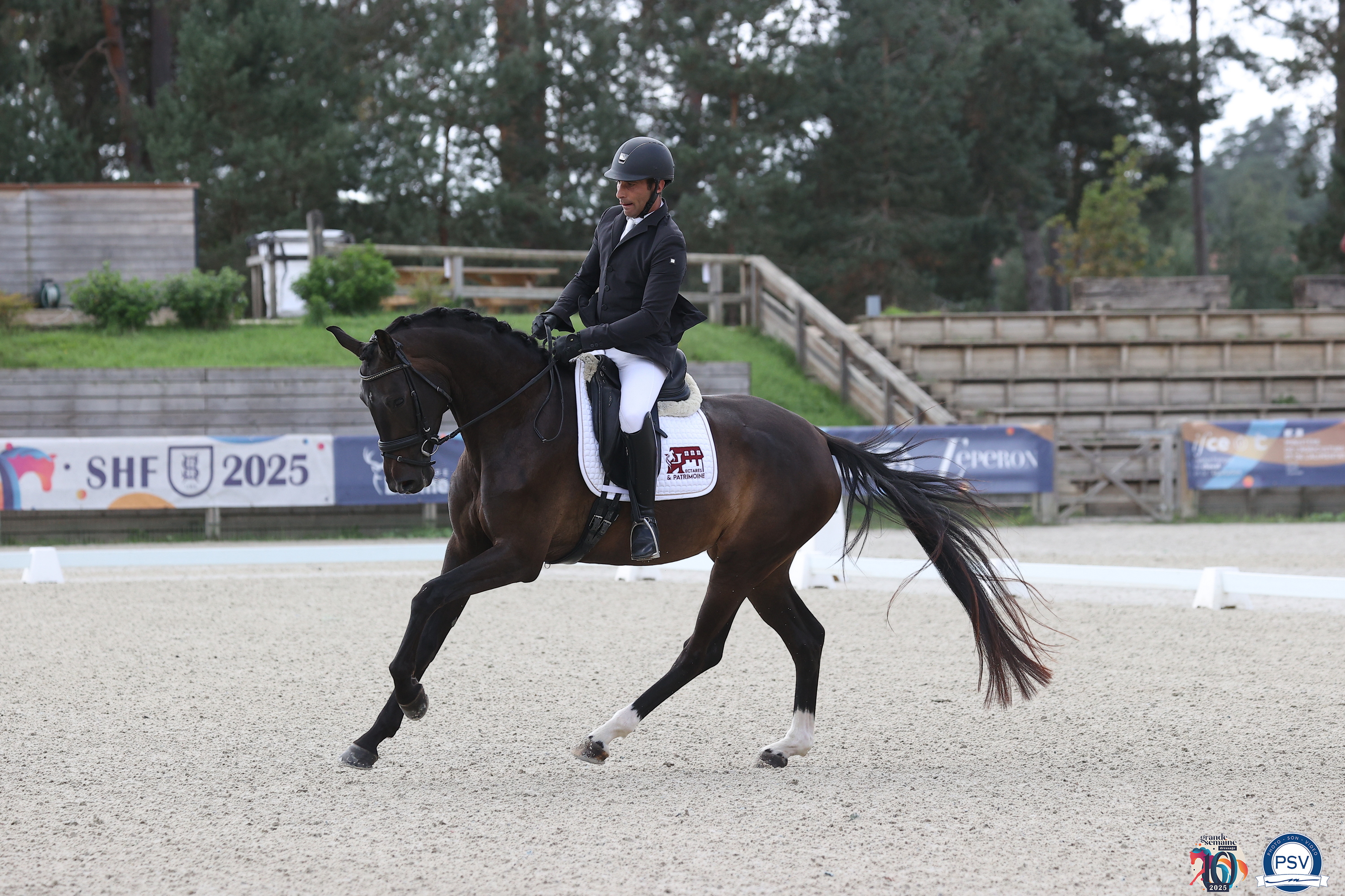 Vice-championne également classée Elite avec une moyenne de 81.20%, agrémentée d’une note au modèle de 15.95, la vice-championne de France des deux ans, et championne des trois ans, L’AMORE MIO MERCOEUR sf, fille de Jovian, kwpn, et de Sole Mio Z par Sandro Hit, (fille de Siolita, kwpn, mère du célèbre Sertorius de Lima), née chez sa propriétaire Marine Ferté et son co-naisseur et cavalier Guillaume Gauthier. Après avoir été responsable d’élevage au Haras de Hus durant sept ans, Guillaume s’installait voilà trois ans sur les soixante hectares de l’élevage Mercœur à Sucé sur Erdre (Loire Atlantique). S’il assure une trentaine de poulinages pour le compte de propriétaires, Guillaume accueille chaque année quatre à cinq poulains avec son associée Marine. Certains sont destinés au dressage, à l‘image du selle français Milano (Kjento VOD, kwpn), vice-champion des trois ans, et d’autres au saut d’obstacles, comme Ipanema Mercœur (Baloubet du Rouet, sf), qui évolue sous la selle d’Emeric George, ou Ho Plaisir Mercœur (For Pleasure, han), en lice au niveau international avec la cavalière italienne Giula Martinengo Marquet. « Je confie les débourrages à Mathieu Mesnier. Je ne peux pas me permettre de tomber car je travaille seul » sourit Guillaume. Ce fut le cas aussi pour L’Amore, dotée de beaucoup de sang, d’un super mental, tout en étant volontaire et très facile au quotidien. « Je l’ai même fait monter par ma nièce qui est Galop 4 cet été. Je n’ai fait que deux concours avant la finale où je suis allé la fleur au fusil. L’objectif était de la préserver et de la monter de façon la plus naturelle possible. Pour nous, la saison de quatre ans doit être considérée comme une formation à la compétition. » Guillaume en convient, élever des chevaux de dressage en France reste un challenge, car les clients potentiels sont beaucoup moins nombreux que pour le saut d’obstacles. « C’est un peu vexant et dommage de constater que le premier réflexe des acheteurs est de se diriger vers les Pays Bas ou l’Allemagne, alors que la France a fait beaucoup de progrès dans la production de ses chevaux. Nous faisons en sorte d’élever de plus en plus de chevaux français, car tout est beaucoup plus simple pour nous au niveau enregistrement et bénéfique côté primes. En revanche nous manquons encore de jeunes étalons labellisés SF. » Autre regret de l’éleveur-cavalier, le manque d’envergure et de visibilité de la finale, un événement qui pour l’instant n’est pas de nature à attirer les investisseurs vers la discipline. Pour sa part, en 2026, la vice championne, qui a assuré un transfert d’embryon avec Glamourdale, poursuivra sa carrière à moins d’être commercialisée dans une « excellente maison. »