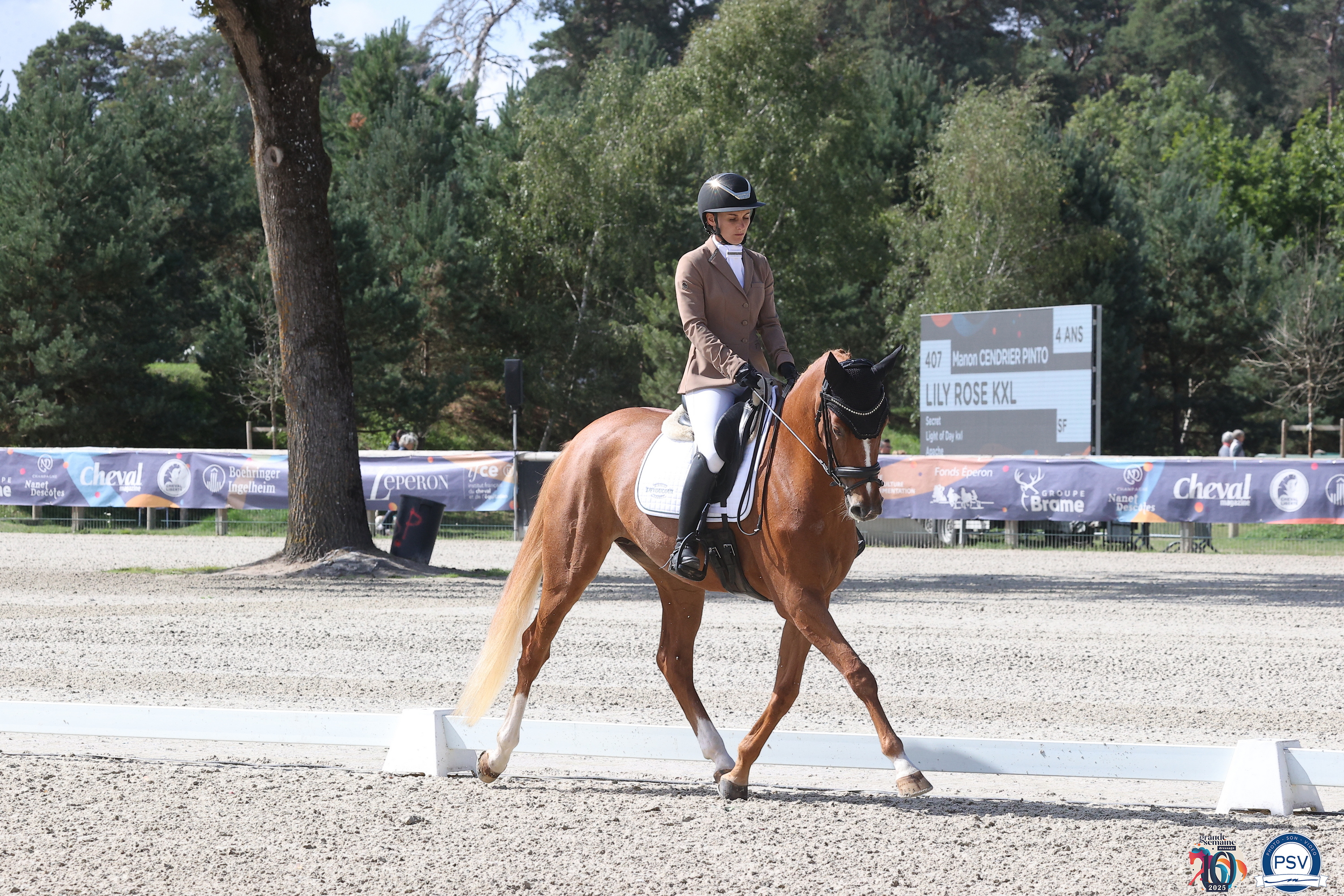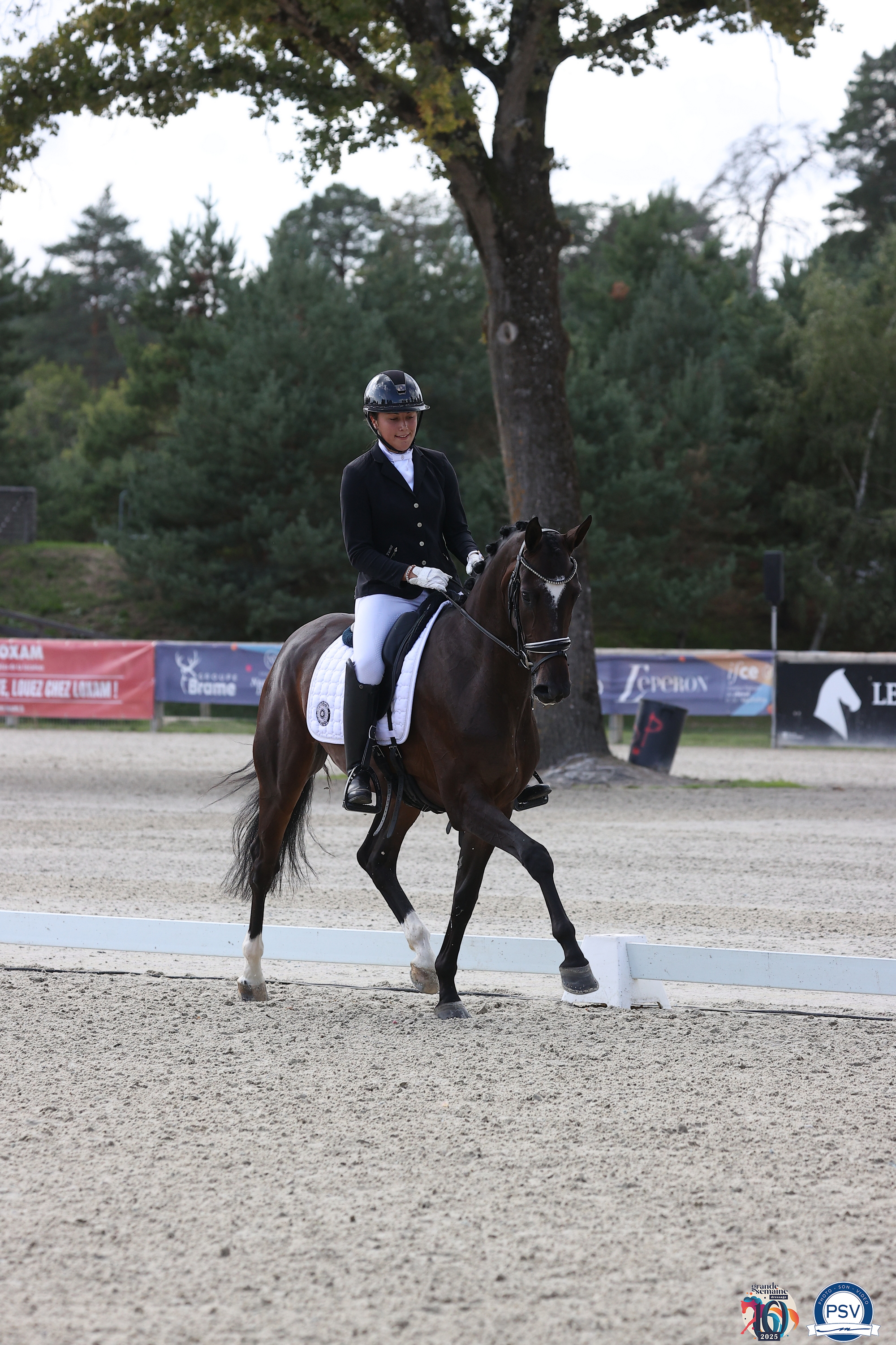 Médaillée de bronze, grâce à une moyenne de 80.82% qui lui vaut la mention Elite sous la selle de Manon Cendrier Pinto, et une note au modèle de 15, 65, LILY ROSE KXL sf, fille de Secret, bawue, et de Light of the Day KXL, kwpn par Apache, est née chez Karine Serneels à Montmorency (95), tout comme son demi frère Lee Roy KXL sf (Secret, bawue), vice-champion des 3 ans en 2024, sa sœur utérine Khaleesi KXL (So Unique, rhein), ou encore son frère utérin Magic KXL (Revolution, westf), champion des mâles en liberté et vice champion des trois ans 2025. La cavalière, installée avec son époux Diogo à la Ferté Gaucher depuis neuf ans, montait sa deuxième finale cette année. « J’ai débourré Lily Rose à trois ans, catégorie dont elle a disputé le championnat. Elle était déjà comme aujourd’hui, très facile à gérer à la maison comme en concours. » En 2026, Lily Rose poursuivra le circuit classique, avec Manon ou avec sa nouvelle propriétaire si la transaction en cours se concrétise. L’éleveuse, dont les produits voient le jour en Seine Maritime, faisait naître ses premiers produits en 2016, grâce à sa jument Uvana, kwpn, mère de Light of the Day KXL, grand’mère de Lily Rose, et à Hellgirl KXL sf (Totilas, kwpn), mère de Lee Roy KXL. « Mon mari Xavier et moi confions une bonne partie de nos produits à Diogo et Manon Pinto. Notre fille Axelle qui va tourner en épreuves Children nous accompagne sur tous les concours. » Si Lily Rose est actuellement à vendre, Karine déplore des difficultés pour commercialiser ses produits. « Nous aurions aimé qu’elle reste en France, mais nous avons davantage d’offres en provenance de l’étranger. En 2026, si nous parvenons à trouver un équilibre financier, nous tenterons de qualifier Lee Roy pour les championnats du monde, Magic abordera le circuit des quatre ans, et nous aurons aussi deux trois ans, dont Next Level, un SF fils d’Iron, old et de Golden Girl KXL, vice championne de France en 2019.»