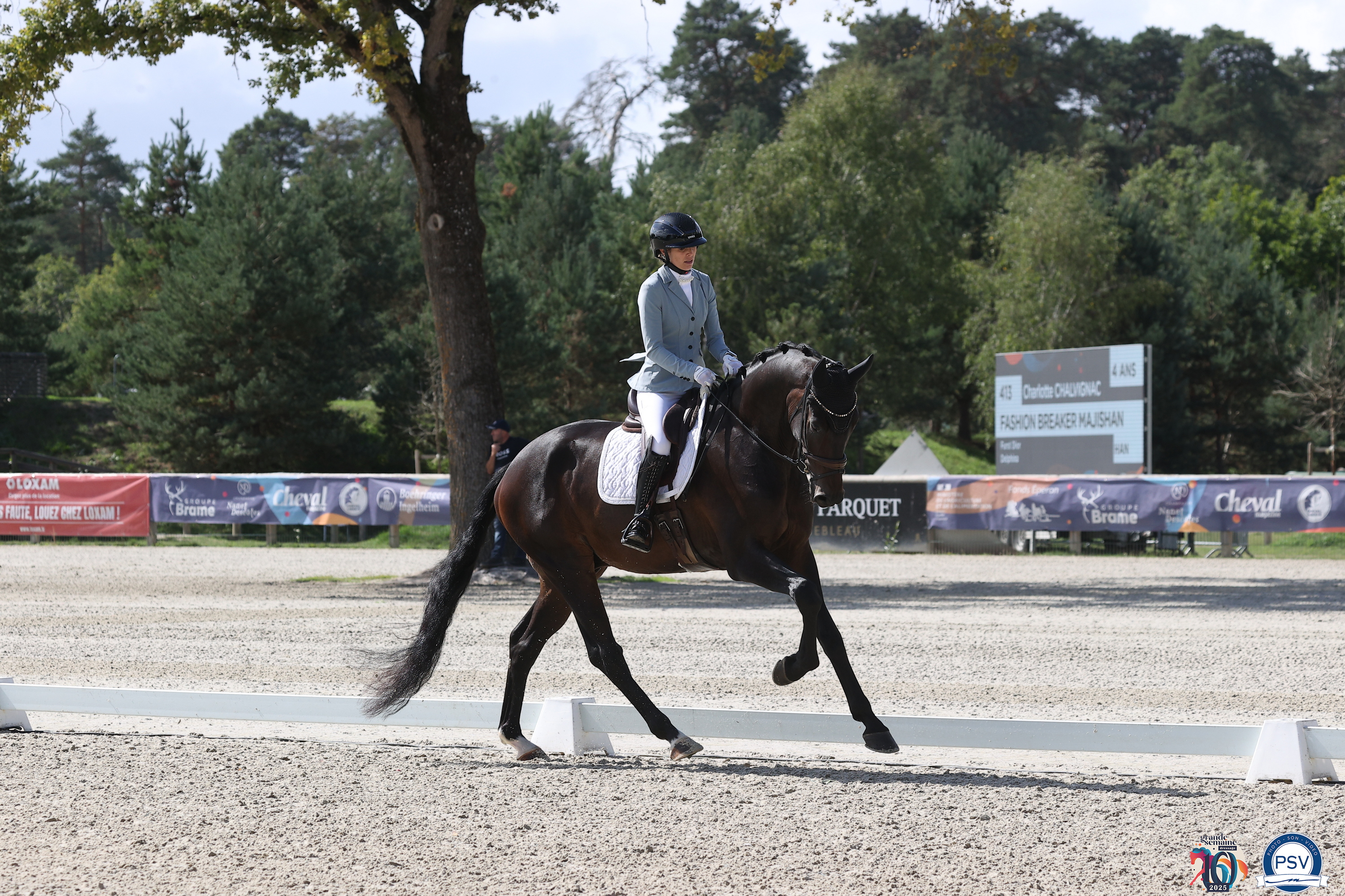 Vice-champion de ce Critérium avec une moyenne de 87% sous la selle de Charlotte Chalvignac-Vesin, le hanovrien FASHION BREAKER MAJISHAN, fils de Furst Dior, Old, et de Delphina, Han, par Diamond Hit, Old. « Il a de très bons rayons, un caractère en or, beaucoup de souplesse et de perméabilité. Nous l’avons acheté chez Bernadette Brune en avril avec Véronique Lesidaner, sa propriétaire qui me le confie » indique la cavalière. « J’ai eu un vrai coup de cœur, et je rends hommage à Charlotte et Jean, qui sont nos guides. C’est encore un gros bébé, mais il a tous les atouts pour courir les cinq ans l’année prochaine », ajoute la propriétaire. La cavalière se disait ravie de son partenaire du jour, en dépit de son manque d’expérience. « Nous l’avons récupéré tout juste débourré de chez Bernadette, et nous nous sommes longtemps posés la question d’emmener les 4 ans à la finale, maintenant qu’il n’y a plus de titre de champion de France, mais nous nous sommes dits que cela ferait certainement plaisir aux propriétaires, ce qui est le cas. C’est un gros événement pour des tout jeunes, d’autant qu’il est encore en pleine croissance. »